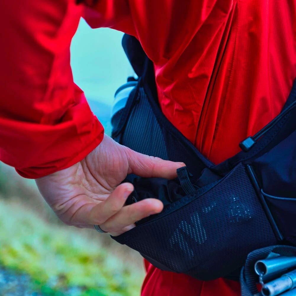 This means you can use it either as a reduced 5-liter race vest for shorter runs or, with the compartment attached, as a larger 12-liter backpack for more gear on ultramarathons or longer runs. Includes 2 x 500ml SOFT FLASKS with two storage options and two easy-access attachment options for poles. All main materials are made from recycled material.