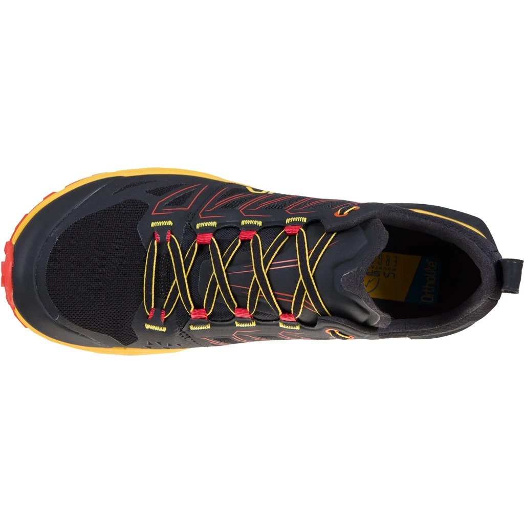 Jackal is the mountain running shoe dedicated to off-road running over ultra distances and for training long-distance workouts on medium distances thanks to the exceptional cushioning guaranteed by the innovative Infinitooâ„¢ high energy return technology. Every detail, from the uppers to the sole, is designed to enhance the comfort of the foot over long distances: wide, comfortable fit designed for use in ultra-marathons, comfort fit, enveloping and soft elastic tongue for maximum freedom of movement with internal bellows to protect against stones and mud. The lacing sees the loops incorporated directly into the side panels of the uppers: a solution that facilitates the adaptation of volumes during long distance runs in which the foot tends to swell. The lateral Net-Mesh promotes ventilation and climate comfort. The heart of Jackal, however, lies in the innovative EVA sole/midsole package with internal cushioning pads in high Energy return polyurethane Infinitooâ„¢ Technology. The front element increases the cushioning, the rear insert contributes to the stabilization of the run. The midsole also incorporates a high-density EVA Rock-Shield for a more stable run with rock-guard effect. The Frixion Red tread with differentiated Impact Brake System lugs and longitudinal FLEX grooves enhances the flex of the sole along the fold lines. The lightweight, shock-resistant, thermo-shaped toecap contributes to the overall lightness and protection of the shoe while the dual compound FriXion Red sole guarantees maximum grip and durability. A concentration of technology inspired by those who run in search of their own limits and in search of themselves . Jackal: find your ultra.Â