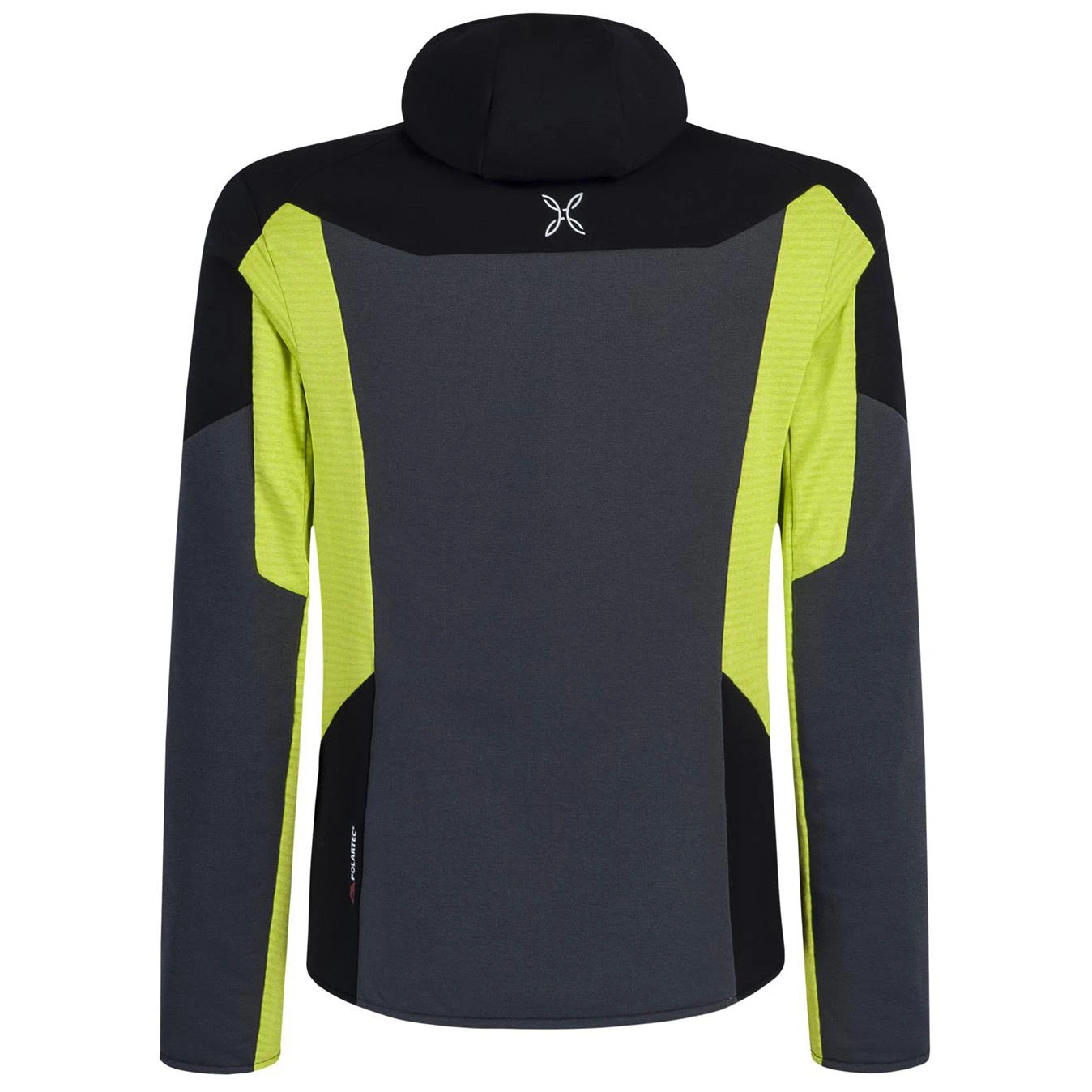 Men’s jacket with hood and made of stretch fleece fabric Polartec Power Stretch Pro made of a blend of polyester and nylon, highly breathable.